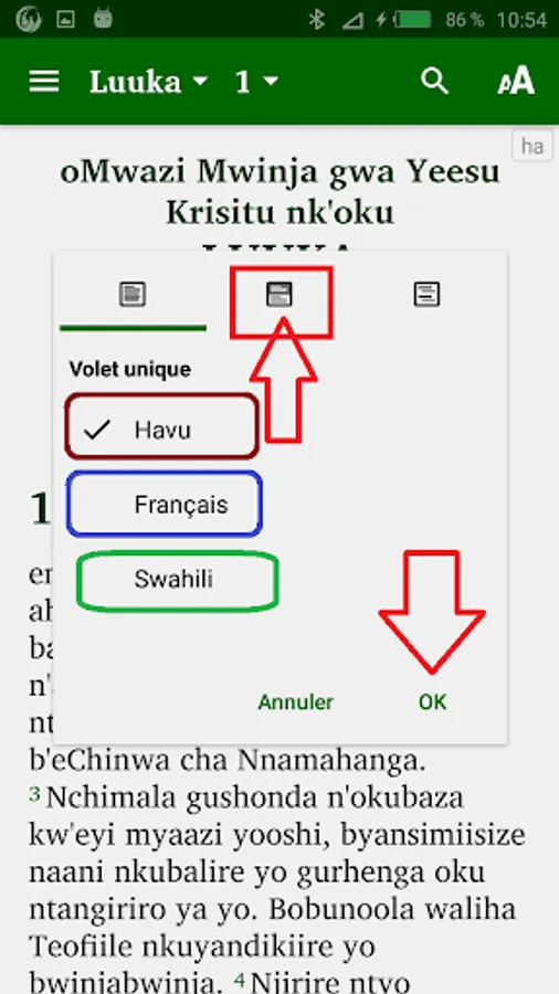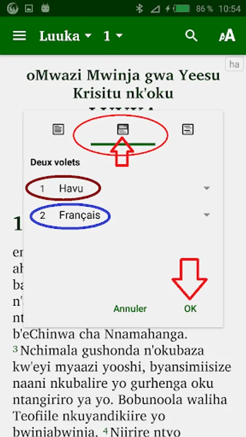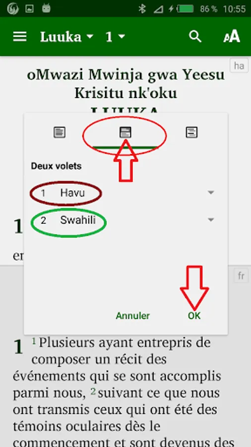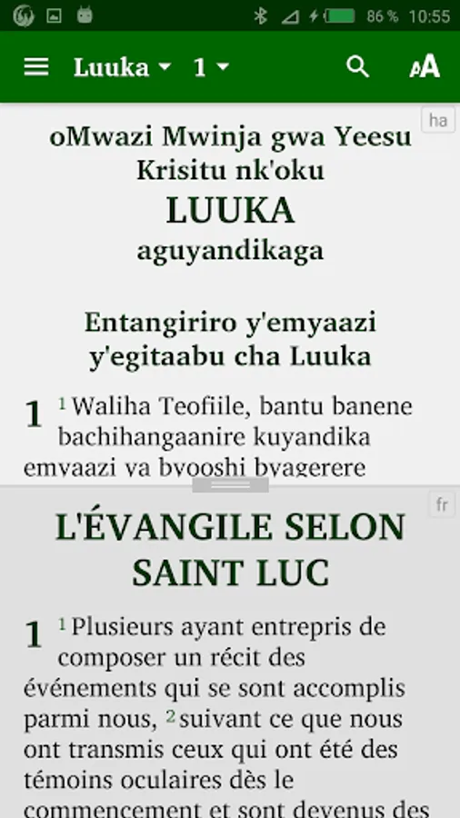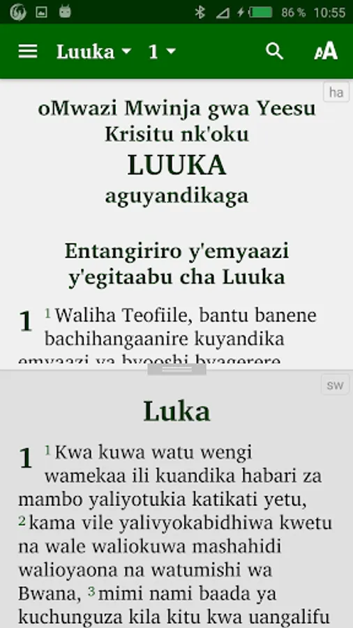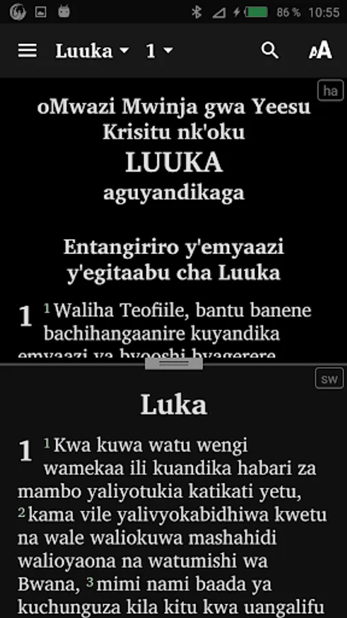 - two panes: to display the Havu at the top and at the same time the Swahili version at the bottom