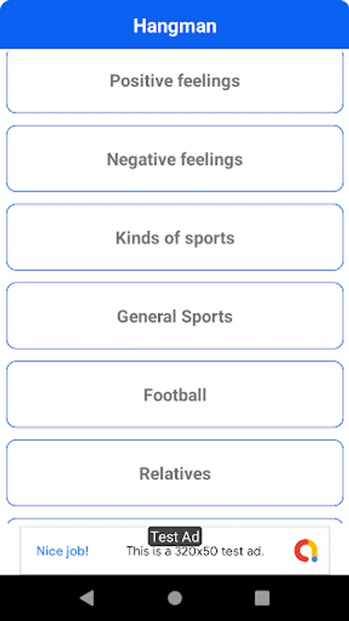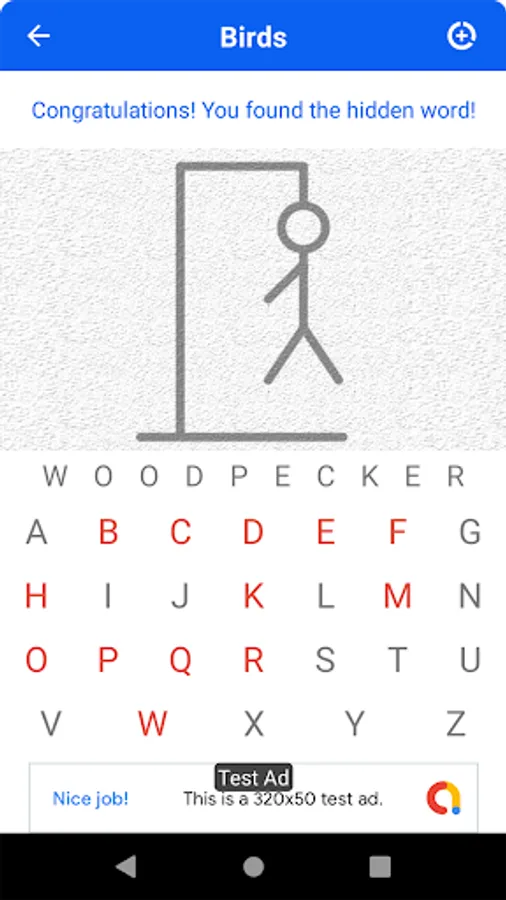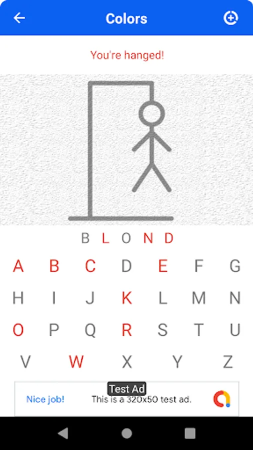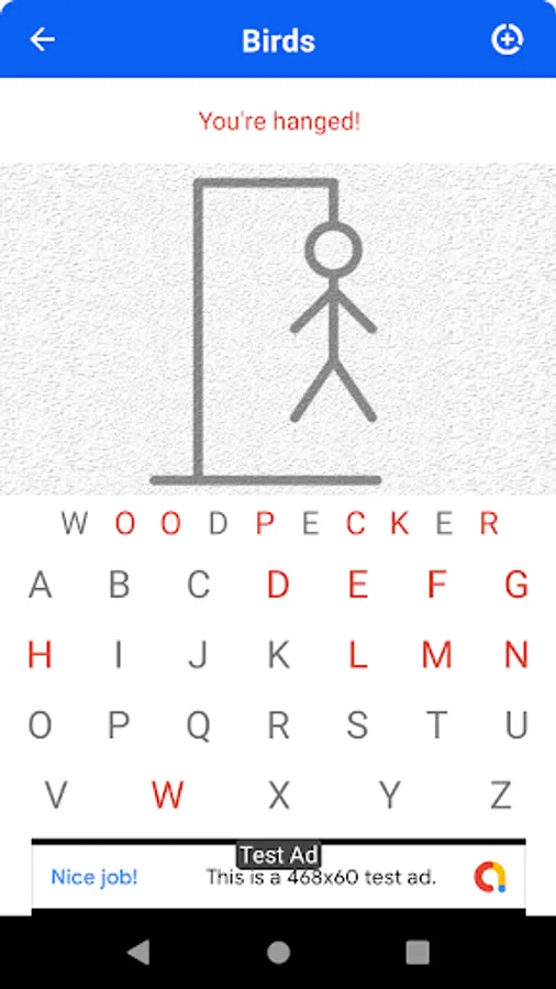 This is version of Hangman - a letter guessing game. You are shown a set of blank letters that match a word or phrase and you have to guess what these letters are to reveal the hidden word. You guess by picking letters from those displayed at the bottom. If you pick a letter that is in the word,that letter is revealed from the blank letters; however, if you pick a letter that is not in the word, then a stickman is drawn. With each wrong letter guess, the man is drawn more and more. When the man is finished, he is hung and the game is lost. This is why the game is called 'Hangman'. If you can reveal all the letters in the word before the man is hung then you are successful and the full word is revealed along with an image showing the meaning of the word. An audio clip should also play if it has been loaded.