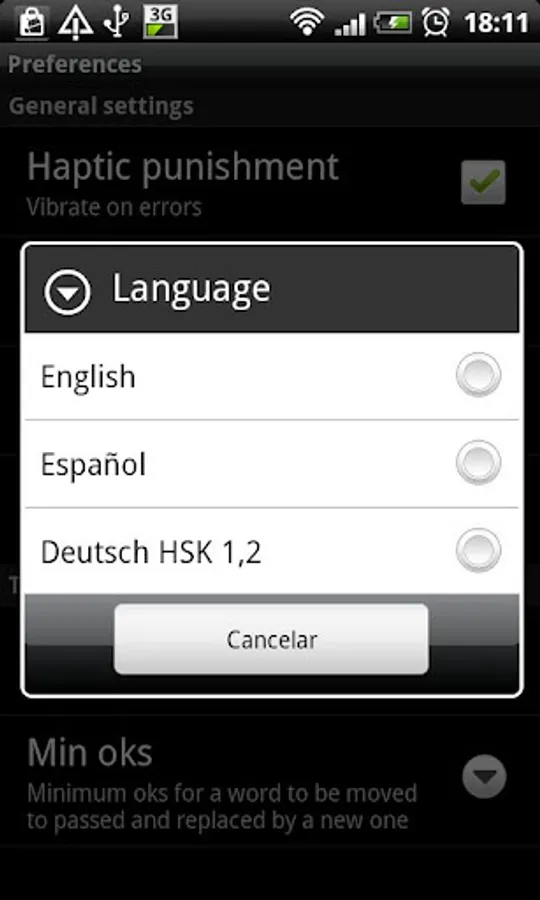 - Access preferences menu form main screen touching HSK level or on Language labels.