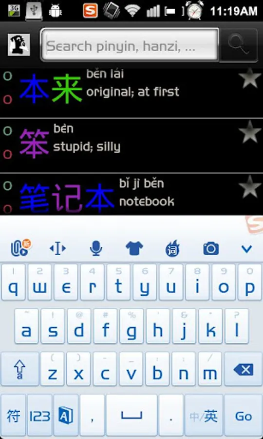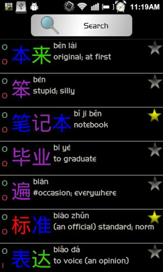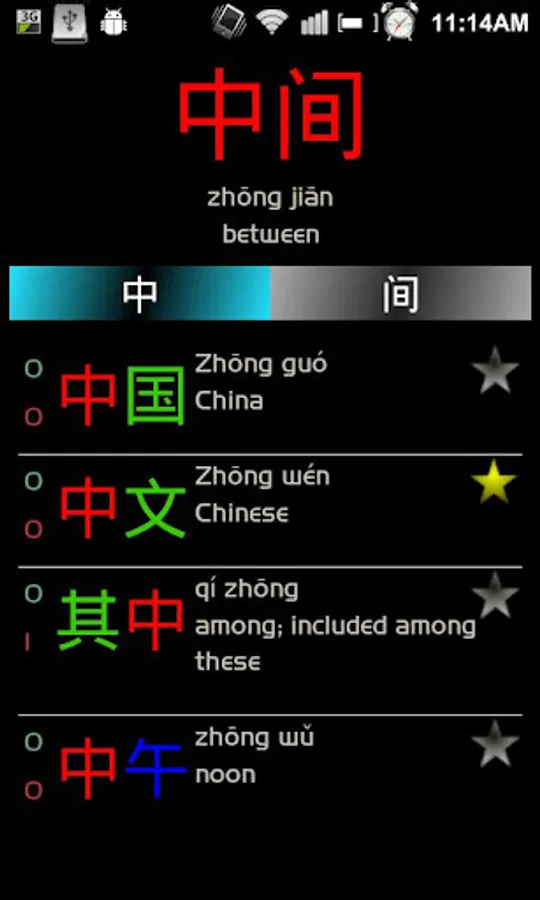 - Related words navigation. From any list of words, taping on the chinese word opens a new screen with details for that word and lists of related words for each of its characters.
