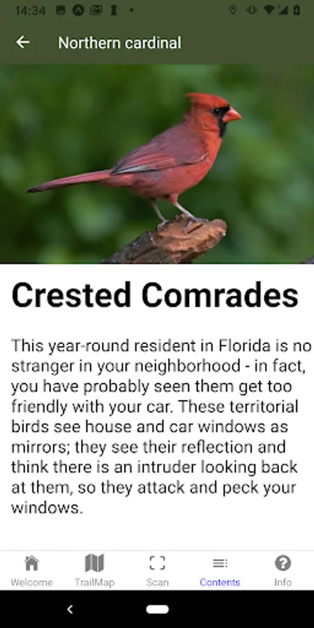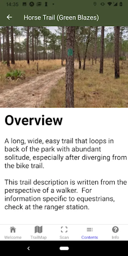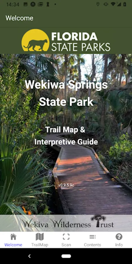 This app provides a trail map and interpretive guide for Wekiwa Springs State Park, located north of Orlando Florida. The trail map shows the routes of all major trails in the park as well as the user's location. The interpretive guide describes the most common flora and fauna that the visitor is most likely to encounter on their travels in the park. There is also an onboard QR Code scanner that can be used to scan signs in the park located next to points or species or ecological communities of particular interest.