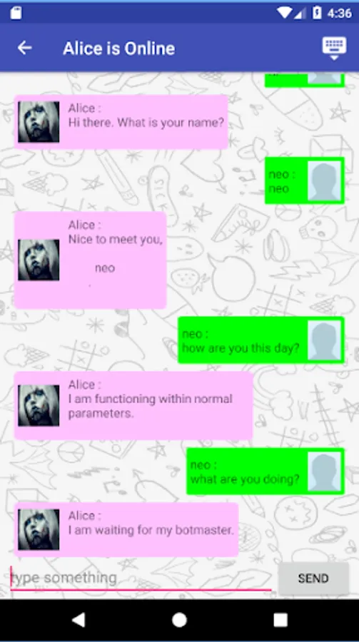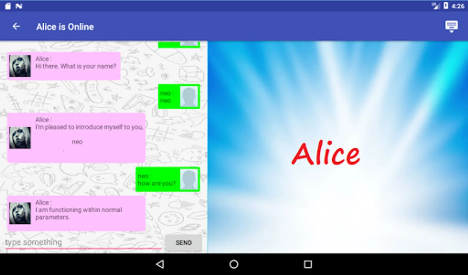 Alice, is a chat bot, a computer program that can chat with you. Discover Alice’s character by chatting with her. Enjoy chatting with Alice any time you want as long as you wish. You don’t even need internet connection. After installing this App, your device will have all Alice’s memories.