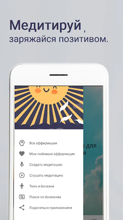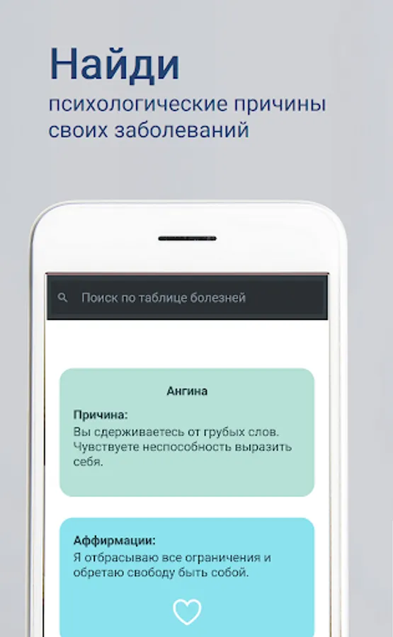 Our application will help you find the psychological causes of diseases. You will find out what you need to change in your thinking in order to feel better. What's more, you can add your own affirmations.