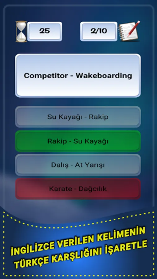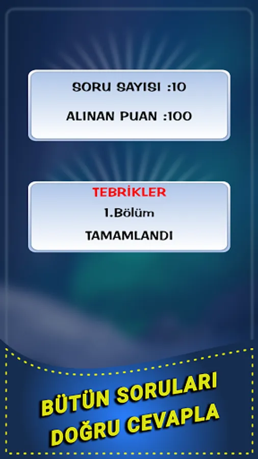 Sorular doğru cevap verdiğinizde buton yeşil renk olacaktır. Bir soruya yanlış cevap verdiğinizde ise o buton kırmızı renk alacak ve doru cevabın butonu yeşil olarak görülecektir. 10 soruluk sistem bittiğinde toplam puanınızı görebileceğiniz ekran açılacaktır.