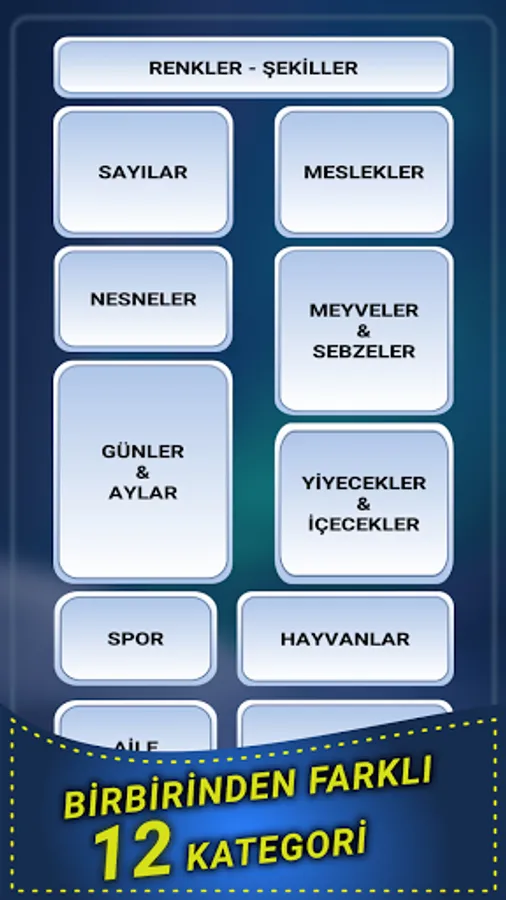 Eğlenceli İngilizce Kelimeler oyunu içerisinde 12 farklı kategori barındırır.