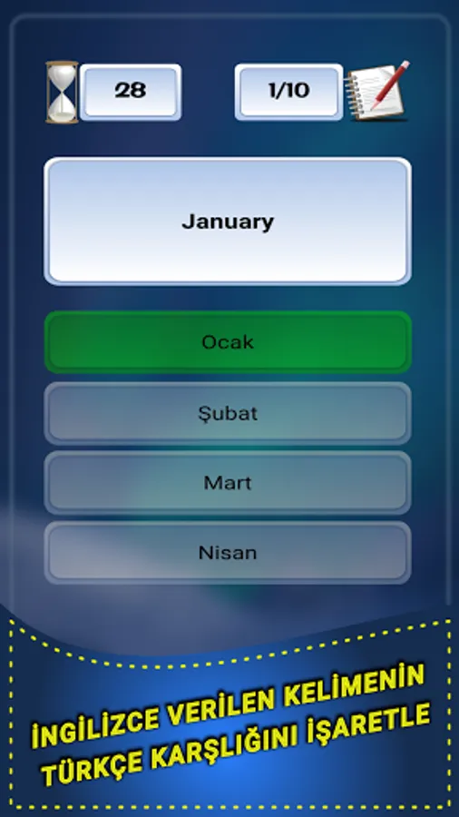 Eğlenceli İngilizce Kelimeler oyunu içerisindeki bir kategoriyi seçtiğinizde size zorluk seviyesi ekranı açılacaktır. Buradan da bir seviye seçtiğinizde kilitli sorular ekranı açılacaktır. İlk etapta sadece 1. sorular ekranının kilidi açık olacaktır ve burada 10 adet soru karşınıza gelecektir. Bir sonraki sorulara geçebilmek için bütün soruları doğru cevap vermeniz gerekmektedir.