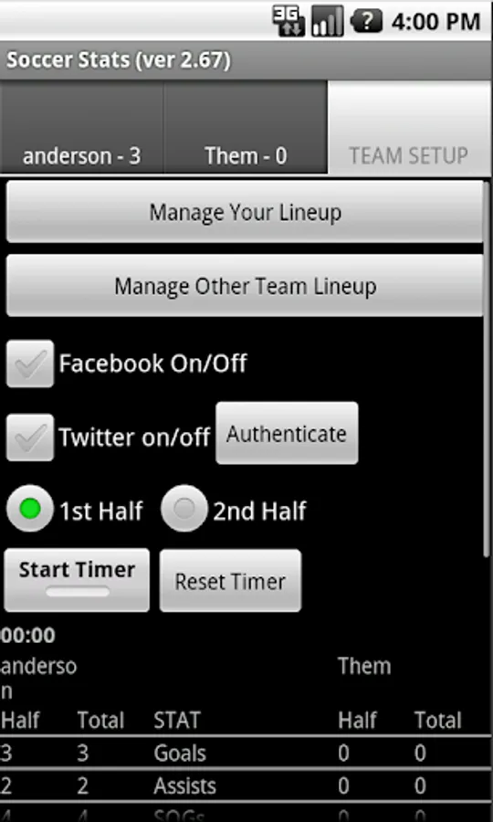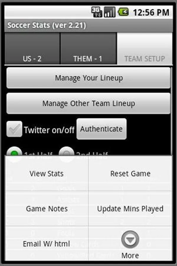 Team Stats are displayed by Half/Total on the Team Setup Tab and are included in email body.