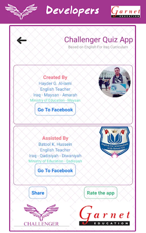 Challenger© is an app that allows users to test themselves in English language "English For Iraq". It aims to help students and teachers to test their ability in English. It also enhances their skills by teaching them the right way of solving such English questions.