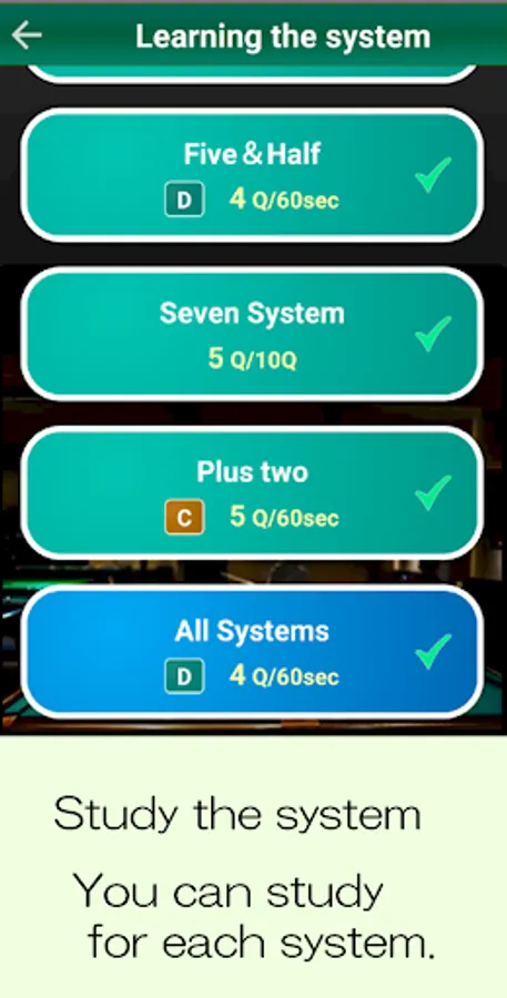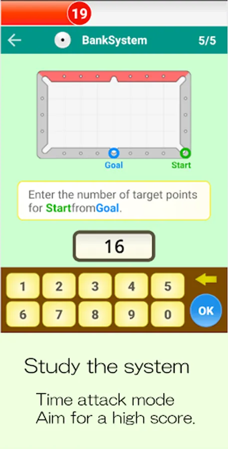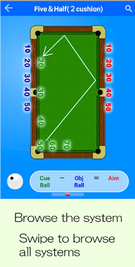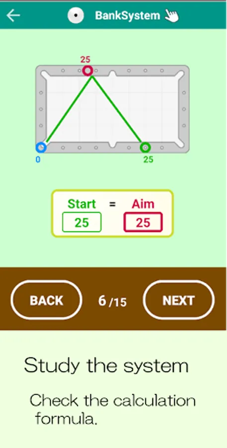 You can learn each system in a quiz format. The billiard table diagram shows the start and finish positions, so use the system calculations to answer the correct number.