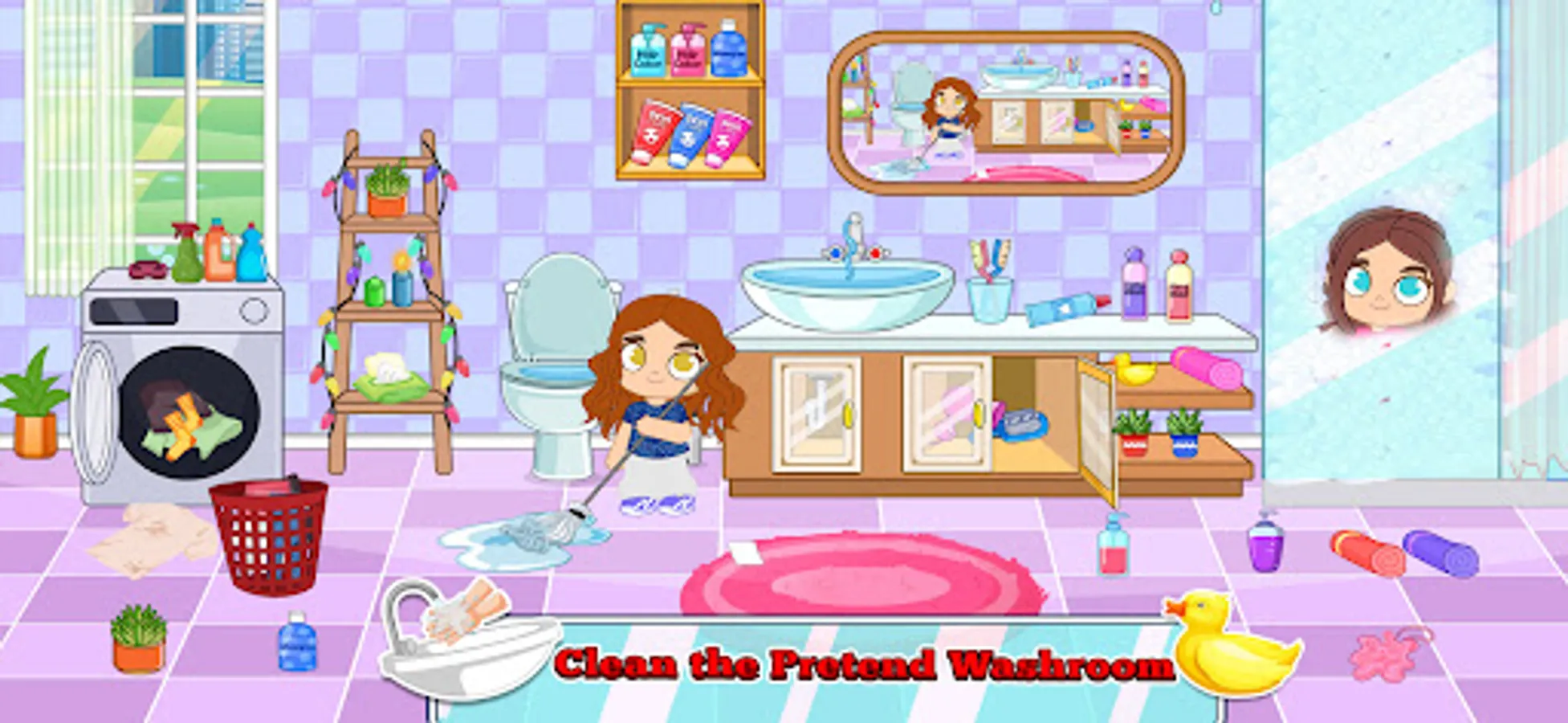 - Explore kitchen, bedroom, playroom, and washroom to experience the cool fun of pretend play games