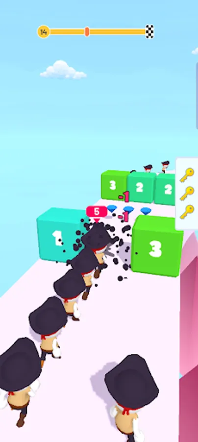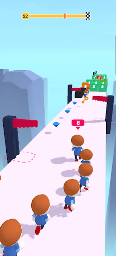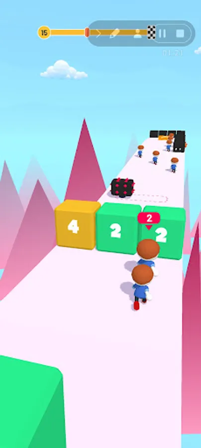 Its Running time , try to collect more guys to cross the blocks without losing , you should good at math to make sure with choosing blocks because it has numbers will reduce you Guys as written on it , there's many characters you will get after collecting some diamonds .