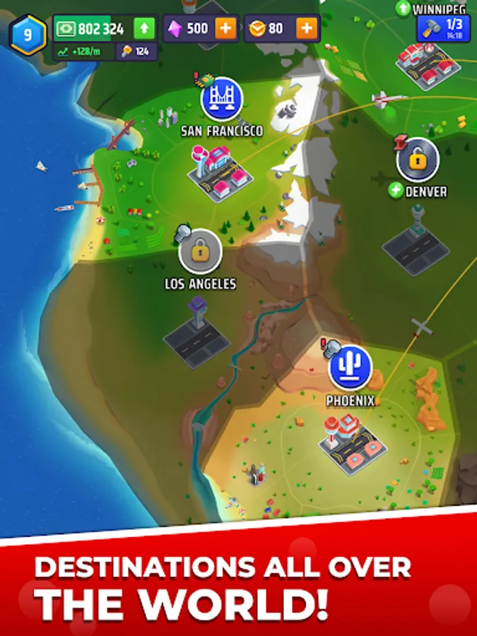 In Idle Airplane Tycoon, develop your airline by unlocking airports from all around the world: open flights to the most exotic destinations!