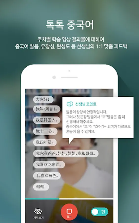 : 녹화된 주차별 학습 결과물에 대하여 중국어 발음, 유창성, 완성도 등 선생님의 1:1 맞춤 피드백이 진행됩니다. 학부모님은 중국어 학습결과물을 영상으로 직접 확인하실 수 있습니다.