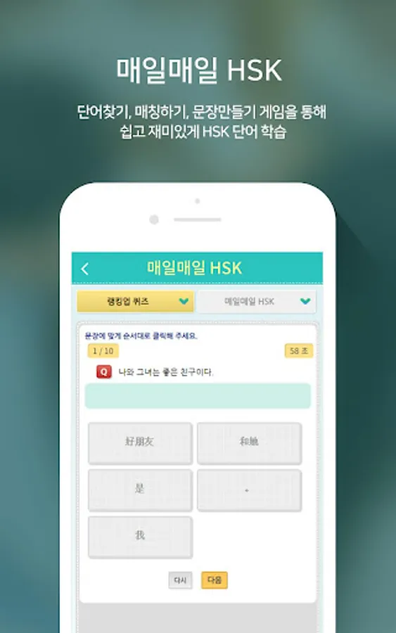 : 회원 수준에 맞는 HSK 급수별 단어를 매일매일 학습합니다. 단어찾기, 매칭하기, 문장만들기 게임을 통해 쉽고 재미있게 HSK 단어를 익힙니다.