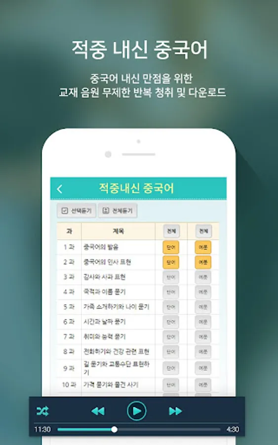 : 중국어 내신 만점을 위한 ‘적중 내신중국어’ 교재의 음원을 무제한 반복 청취할 수 있으며 다운로드도 가능합니다.