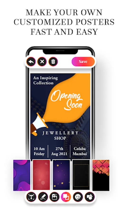 With our poster maker app, create your own designer posters, offer announcements, cover photos, advertisement, and many more on the spot.