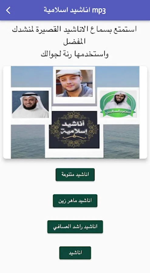 تطبيق يوفر اناشيد اسلامية ودينية جميلة بصيغة mp3، تتوفر اناشيد لماهر زين واناشيد اسلامية لراشد العسافي، واناشيد اسلامية لمنصور السالمي، بالاضافة لأناشيد متنوعة.