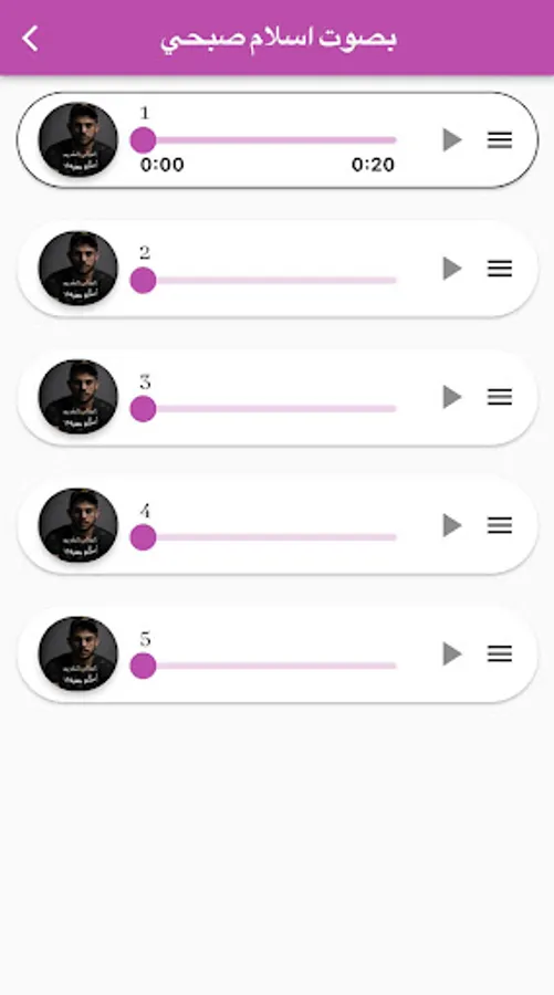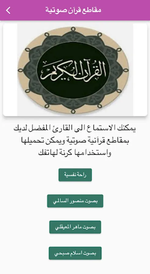 يوفر هذا التطبيق مقاطع للقران الكريم صوتية وقصيرة بصيغة mp3، تتوفر قراءة عطرة ومؤثرة لثلاث قراء