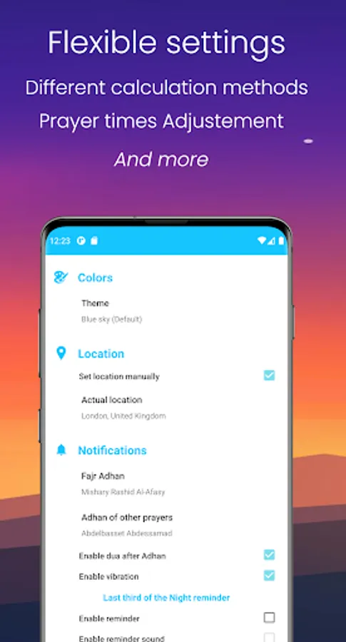 - Different prayer times calculation methods.