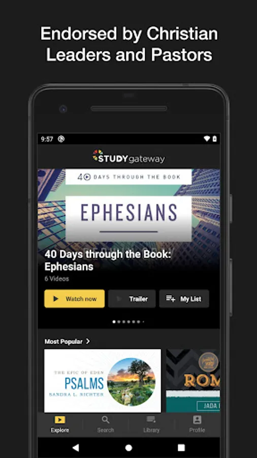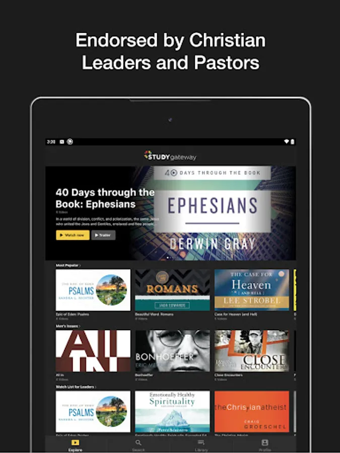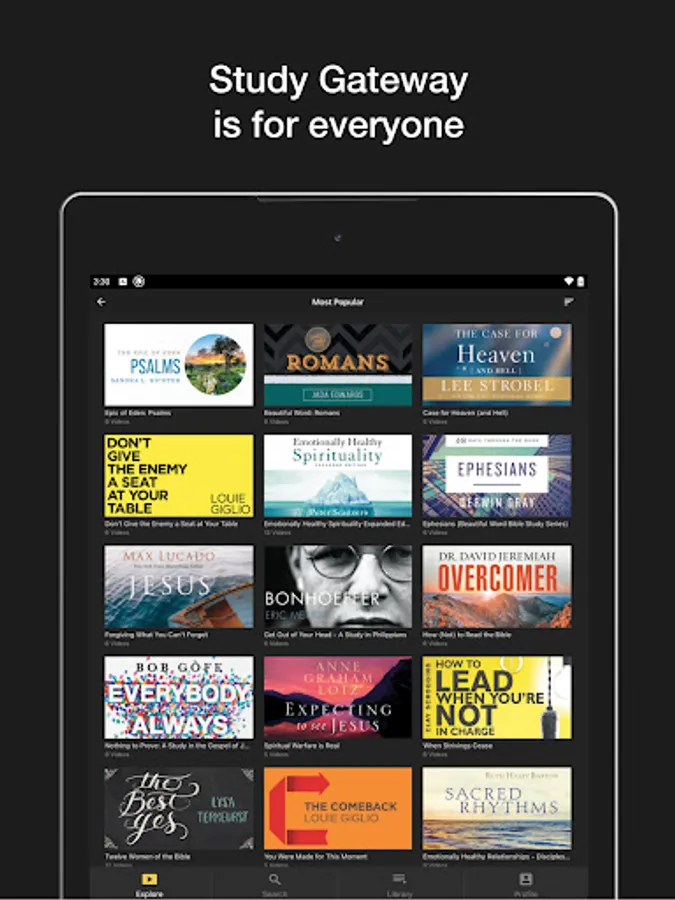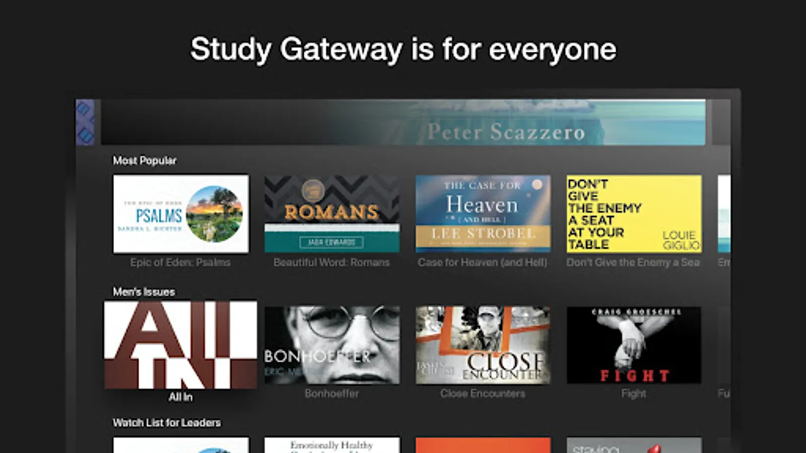 Study Gateway is the streaming video Bible study service from Zondervan and Thomas Nelson, featuring the world’s most-trusted Bible teachers, authors and pastors, including Max Lucado, Anne Graham Lotz, Louie Giglio, Rick Warren, Derwin Gray, Lysa TerKeurst, Jennie Allen, Andy Stanley, Chrystal Evans Hurst, John Ortberg, Ann Voskamp, Christine Caine, Jada Edwards, Bob Goff, and Jim Cymbala. Watch thousands of Bible study videos on subjects like discipleship, overcoming and healing, Christian living, and Bible discussion. Get the app as a part of your Study Gateway subscription.