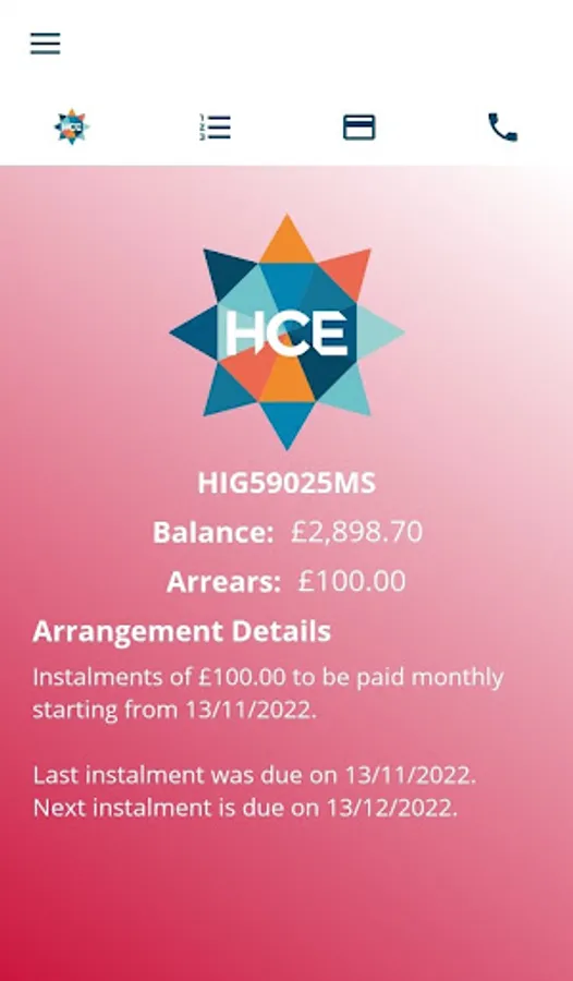 The app shows the amount owed, what has been paid (including date and amount), payment arrangement details and what is outstanding, with user-friendly colour-coding: