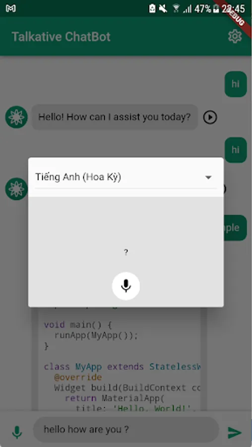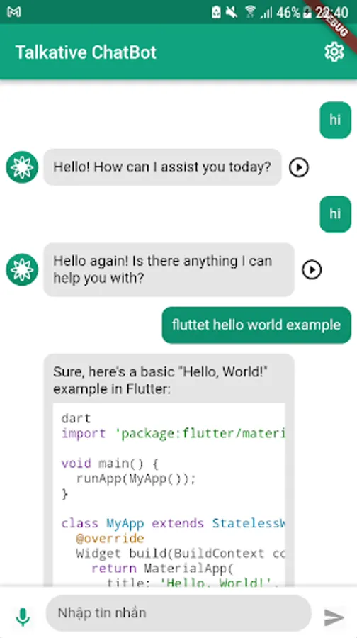 Talkative is a smart chat application, built on top of OpenAI's ChatGPT - 3.5. With the ability to self-study and auto-response, the application can help you answer all questions from many different specialties and aspects with full features such as chat, voice with ChatGPT, delete message history, ... With an easy-to-use interface, suitable for all ages.