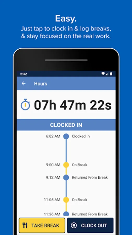 π· Just tap: Simply tap to clock in/out and log your lunch and breaks in real time throughout the day.
