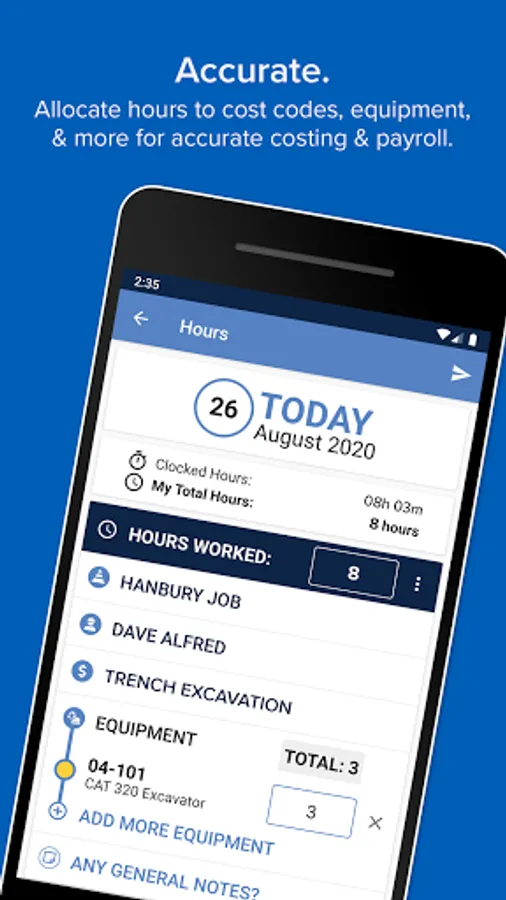 π· Get specific: Itβs easy to record your own hours across various jobs, foremen, equipment, and even cost codes for accurate costing and payroll.