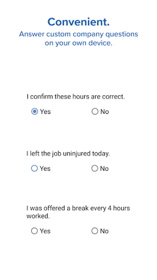 π Documentation: Capture daily answers to custom company questions. By simply tapping Yes or No, workers can quickly confirm whether their time is correct, they were offered breaks, they left the job uninjured, or any other info that you need to document.
