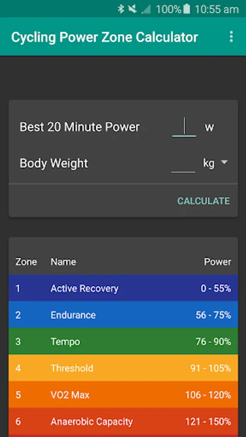 Good for road cycling, triathlon, mountain biking to calculate the correct power training zones.