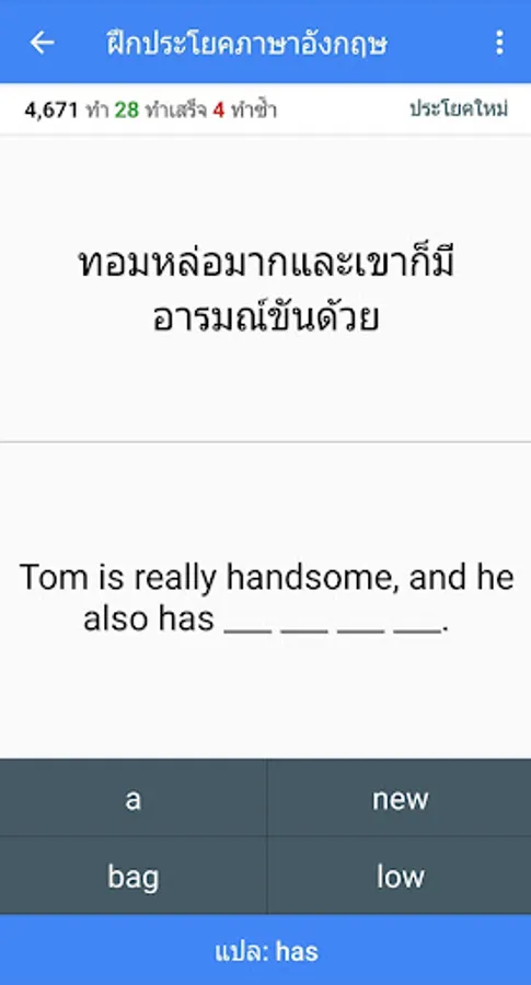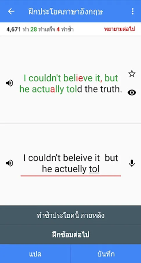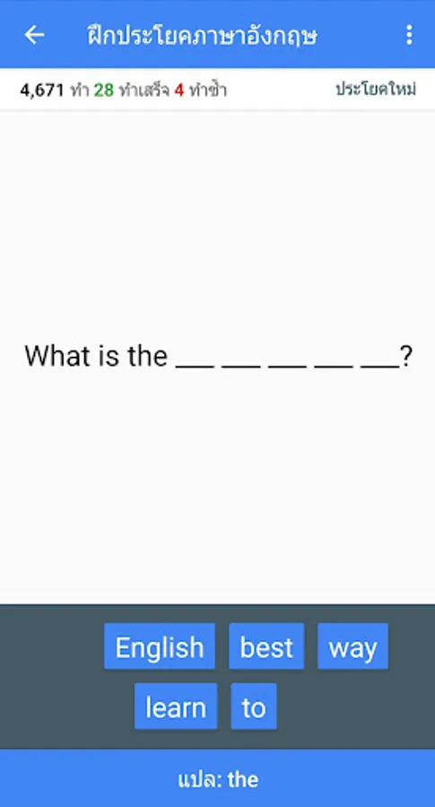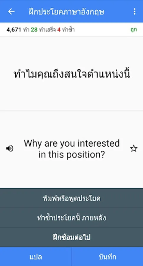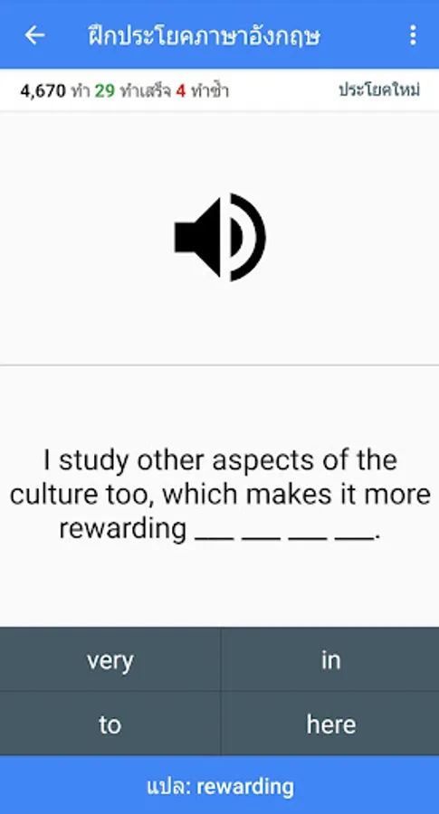 Listen to the English sentence and choose each word correctly in the sentence. You will not see the translation of the Thai sentence until the end.