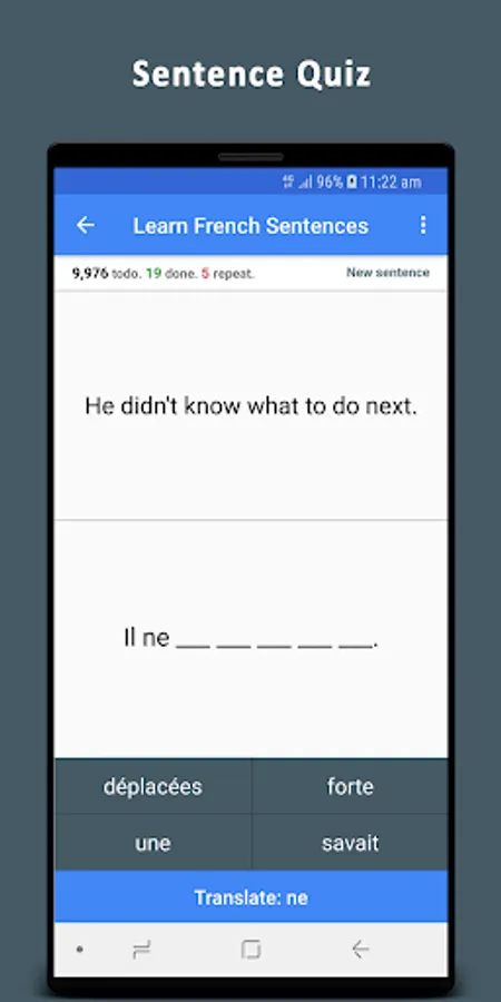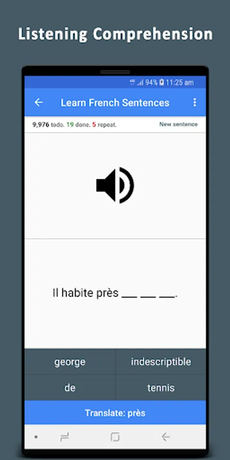 Listen to a sentence in French and then correctly guess each word in the sentence. You won't be shown the English translation of the sentence until the end.
