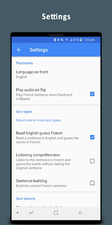 Create your own French dictionary using annotations, once you create an annotation for a word, when that word appears in a quiz, your annotation will also appear above the sentence.
