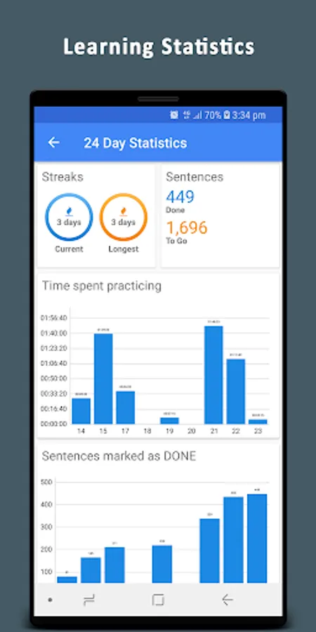 View your daily statistics for the number of sentences you’ve completed and time spent doing quizzes. Also keep track of consecutive day streaks.