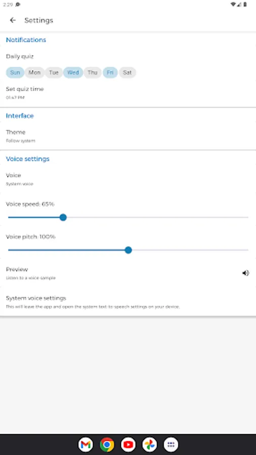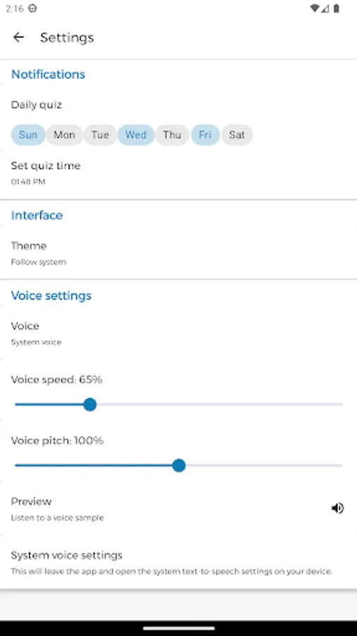 Sentences are read using your devices Text to Speech engine. We recommend installing Google’s Text to Speech engine and enabling it in your phone’s settings. You can choose Male or Female voice as well as speech rate and speed in the Text to Speech settings.