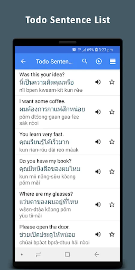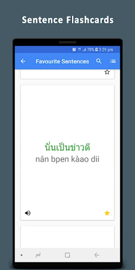 Easily save and access your favorite Thai sentences and phrases by selecting the star next to any sentence in the app, allowing you to practice and master them more efficiently.