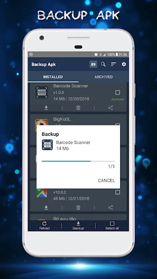 All applications in the phone are backed up easily and quickly. After backing up these applications will be stored in the folder of the device. Backup apk displays all the applications that the user has backed up. Users can easily install the application, delete it from the list of archives or share apps to friends.