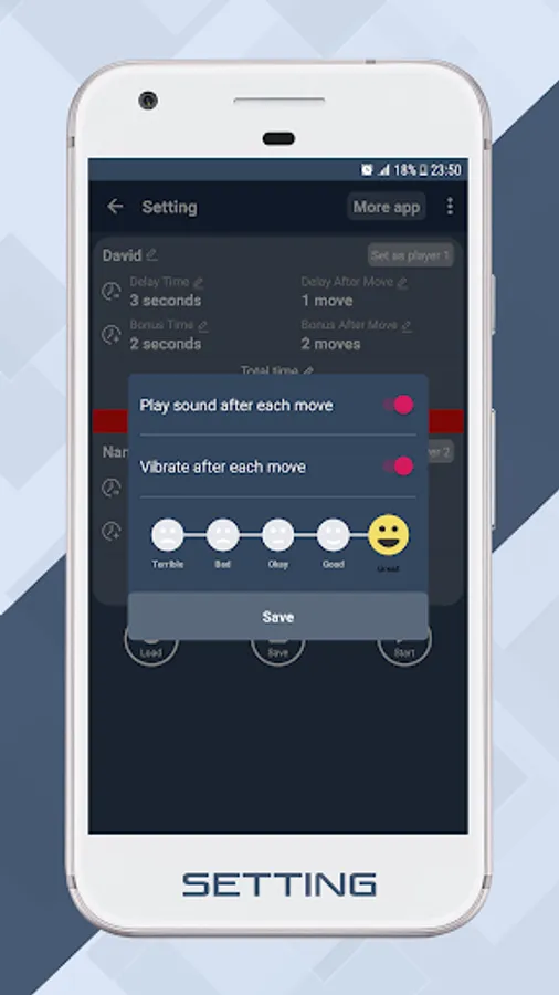 Real chess clock supports users to set up a way of calculating the time suitable for each player's play (timer set, chess clock time control). Users can change the total match time, delay time and added time will be calculated after some moves specified by the player. These settings will be saved for easy use in the next game.