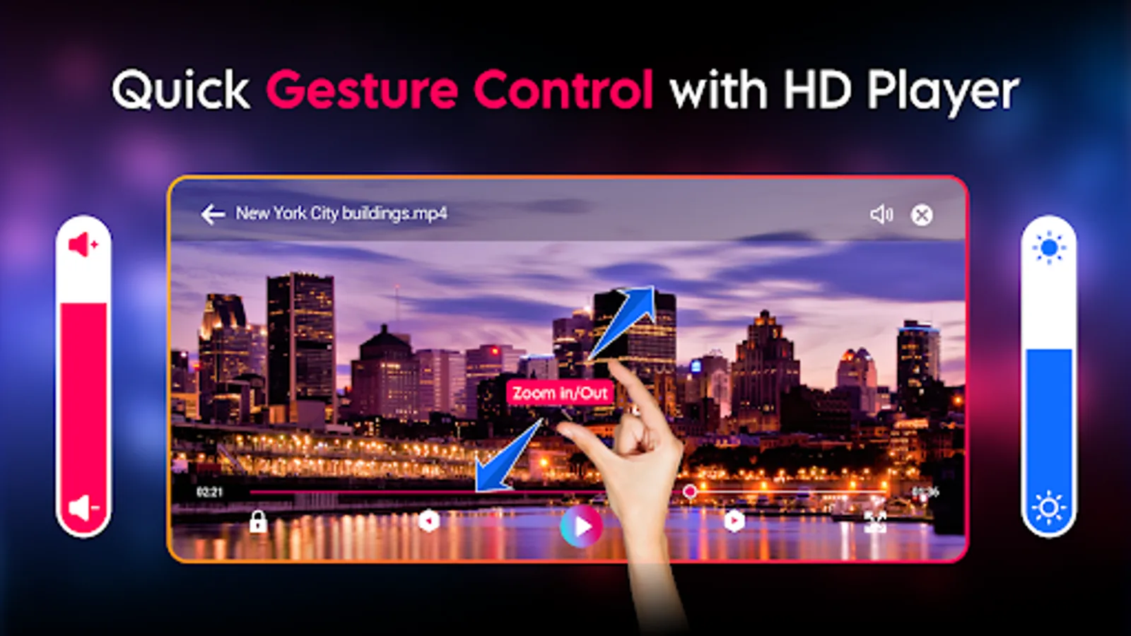 Video Player supports gestures to easily adjust the screen brightness and video volume when you are watching the video. And you can click the button to quickly control the videosβ progresses and the last or next video to play. In addition, locking screen, floating window playback, horizontal and vertical screen switching, trimming current interface, adjusting screen sizes features are ready for you!