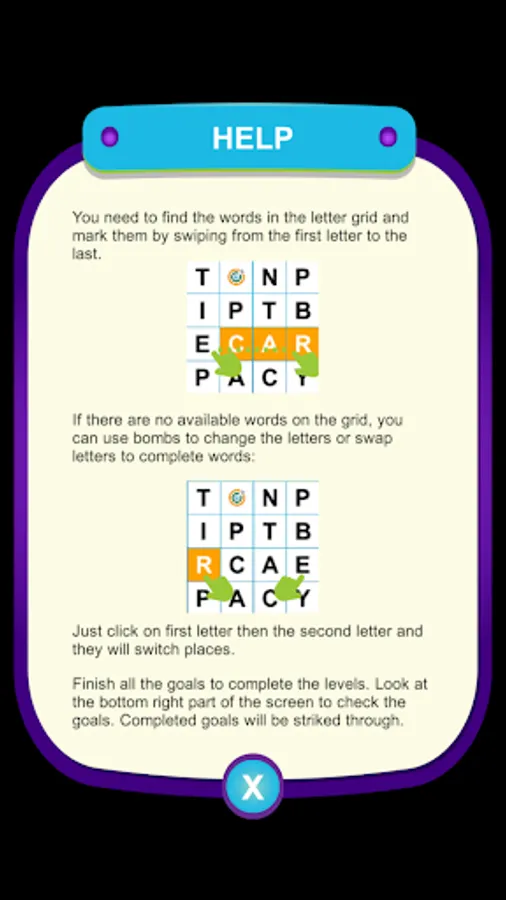Swap: You can select two letters and swap their places. If you see a part of the word on the grid, you can complete it by swapping some letters. You get a new swap credit every few seconds. If you don’t have swap credit, you can still swap letters by spending one diamond.