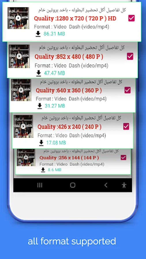 * Support download quality ranging from 144p, 240p, 360p, 480p, 720p, HD, 1080p, Full HD, 2K to 4K .
