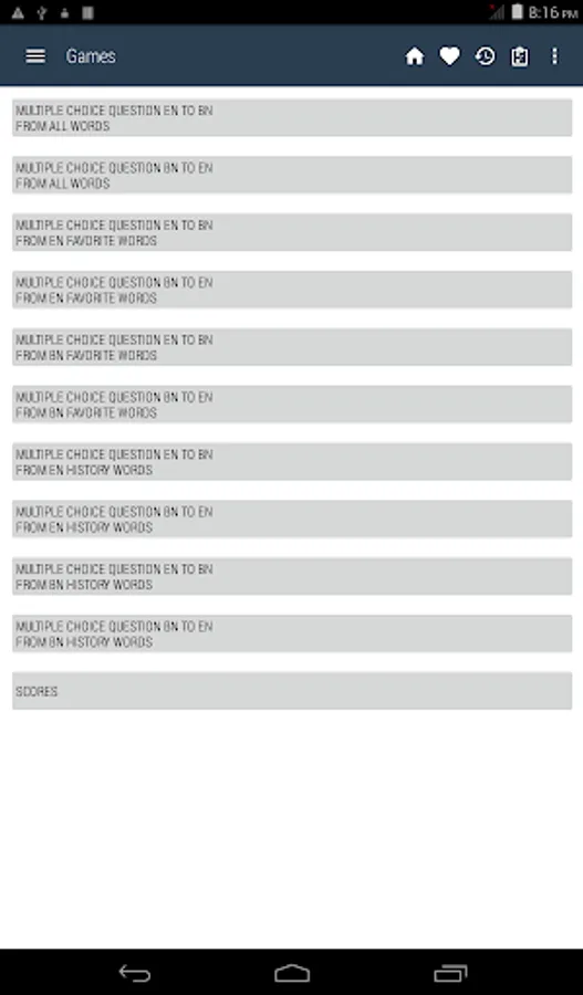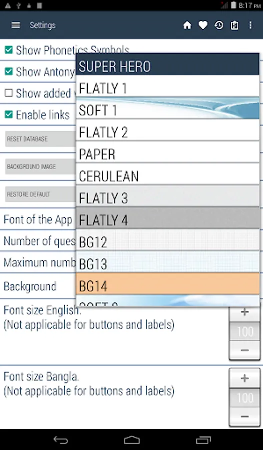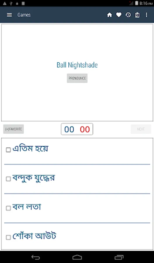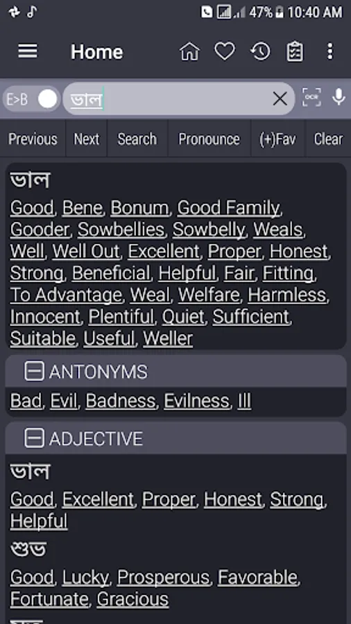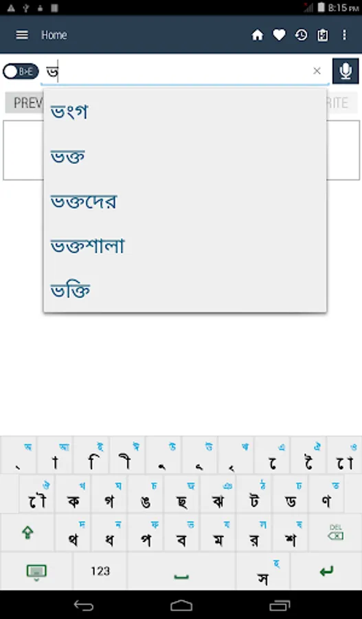 Bangla <> English Dictionary offline and free. You can search both English and Bangla words. You can search words directly from "Internet Browser" or other Applications by using Sharing option. In the sharing option you will find "Bangla Dictionary" and choosing "Bangla Dictionary" will open the dictionary with the shared word so you need not type. Exiting from the dictionary will return you to "Internet Browser" or other Applications again. This is not only a Dictionary but also a learning tool. You can use this dictionary when you have no Internet connection. MCQ (Multiple Choice Question) option is available. There is autosuggestion so you need not type full words. You also can use Speech to text feature. You can add words to the study plan and remove words from the study plan. When you start typing, you will see some words starting with the letters you typed. The dictionary searches in a database for the matching words. This can slow down typing in small handsets. Therefore in settings there is an option to turn that off. So low profile mobile handsets can turn off Auto search to type quickly. You will see a Dictionary icon on the notification bar to start the app quickly. On sharing text you will find the Bangla Dictionary. This will be helpful to find out the meaning of any word.