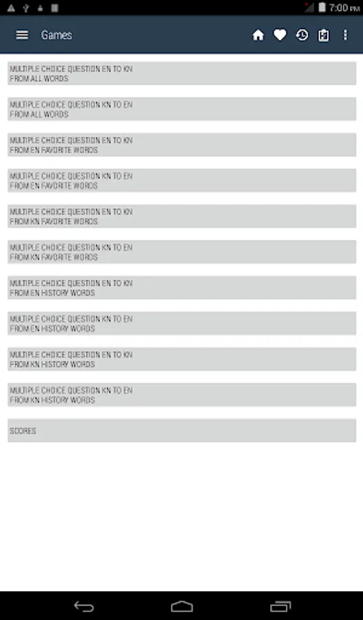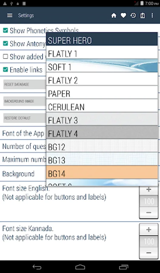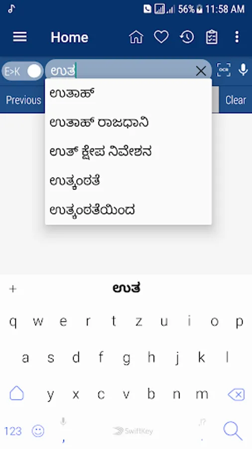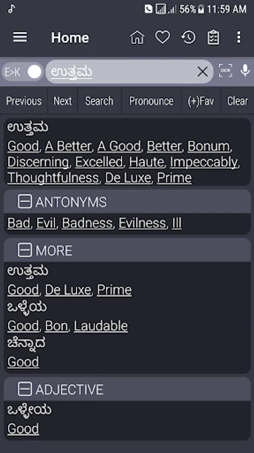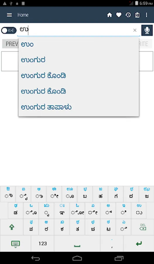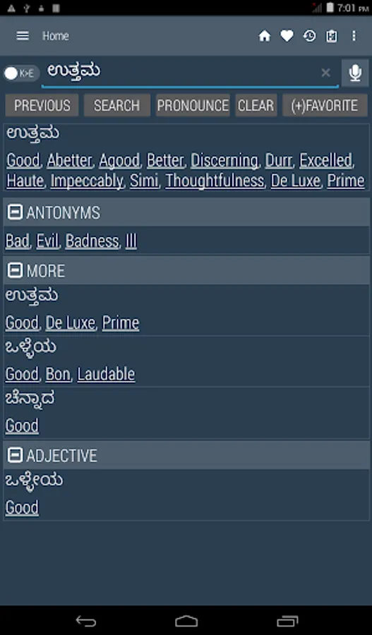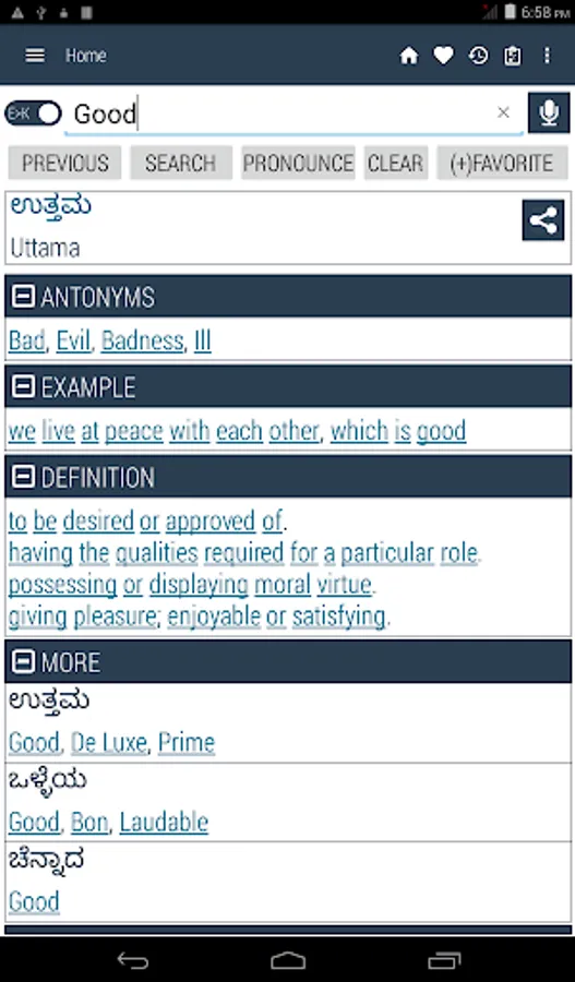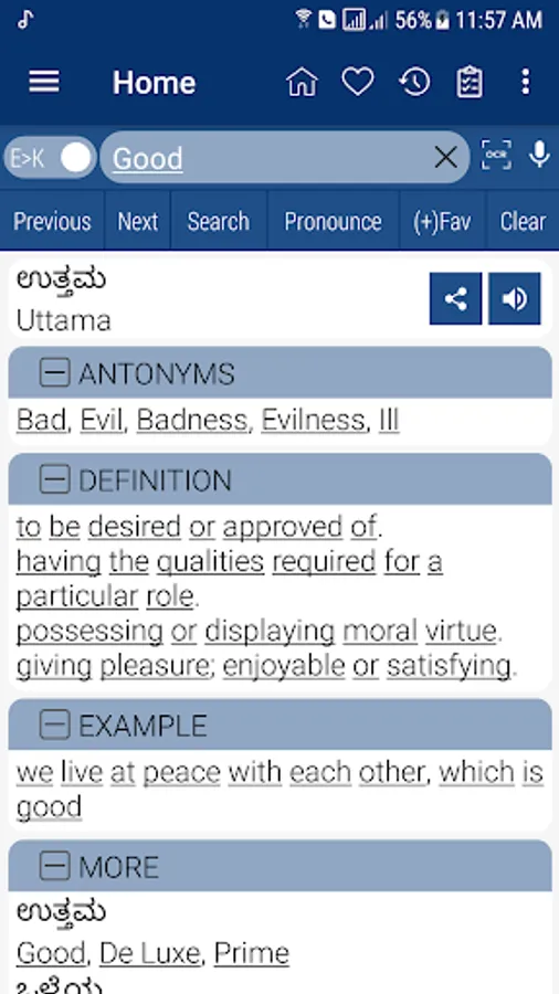Kannada <> English Dictionary offline, with definition and free. You can search both English and Kannada words. You can search words directly from "Internet Browser" or other Applications by using Sharing option. In the sharing option you will find "Kannada Dictionary" and choosing "Kannada Dictionary" will open the dictionary with the shared word so you need not type. Exiting from the dictionary will return you to "Internet Browser" or other Applications again. This is not only a Dictionary but also a learning tool. You can use this dictionary when you have no Internet connection. MCQ (Multiple Choice Question) option is available. There is autosuggestion so you need not type full words. You also can use Speech to text feature. You can add words to the study plan and remove words from the study plan. When you start typing, you will see some words starting with the letters you typed. The dictionary searches in a database for the matching words. This can slow down typing in small handsets. Therefore in settings there is an option to turn that off. So low profile mobile handsets can turn off Auto search to type quickly. You will see a Dictionary icon on the notification bar to start the app quickly. On sharing text you will find the Kannada Dictionary. This will be helpful to find out the meaning of any word.