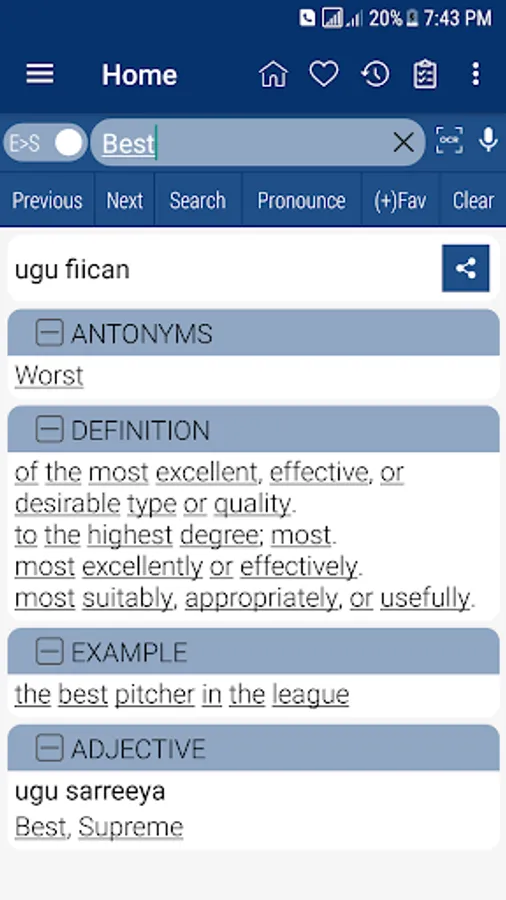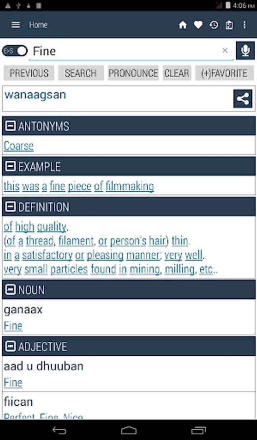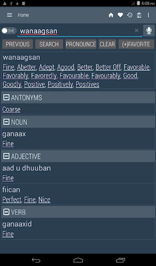 Somali <> English Dictionary offline, with definition and free. You can search both English and Somali words. You can search words directly from "Internet Browser" or other Applications by using Sharing option. In the sharing option you will find "Somali Dictionary" and choosing "Somali Dictionary" will open the dictionary with the shared word so you need not type. Exiting from the dictionary will return you to "Internet Browser" or other Applications again. This is not only a Dictionary but also a learning tool. You can use this dictionary when you have no Internet connection. MCQ (Multiple Choice Question) option is available. There is autosuggestion so you need not type full words. You also can use Speech to text feature. You can add words to the study plan and remove words from the study plan. When you start typing, you will see some words starting with the letters you typed. The dictionary searches in a database for the matching words. This can slow down typing in small handsets. Therefore in settings there is an option to turn that off. So low profile mobile handsets can turn off Auto search to type quickly. The Somali Dictionary is in the "Sharing Text" which is useful for finding out the meaning of a word.