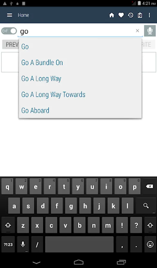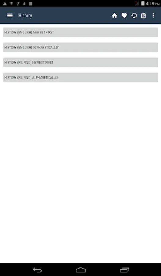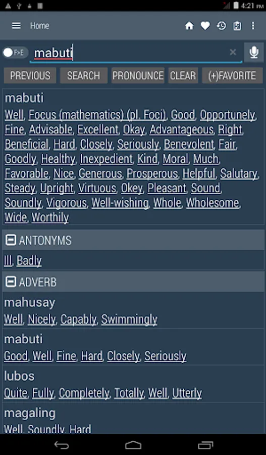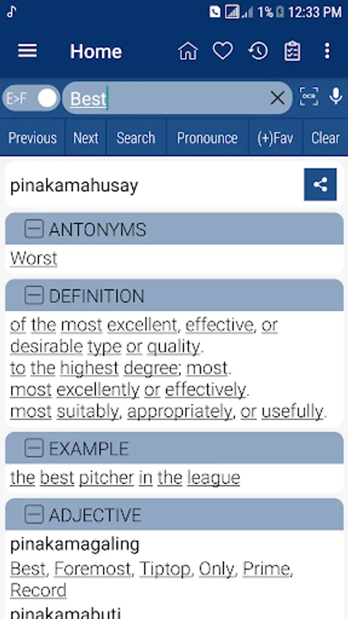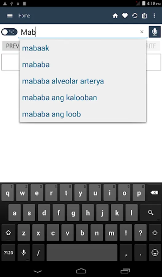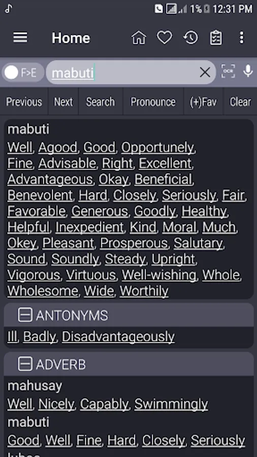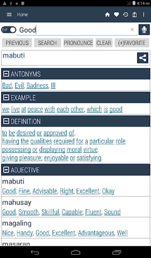 Tagalog <> English Dictionary offline and free. You can search both English and Filipino words. You can search words directly from "Internet Browser" or other Applications by using Sharing option. In the sharing option you will find "Filipino Dictionary" and choosing "Filipino Dictionary" will open the dictionary with the shared word so you need not type. Exiting from the dictionary will return you to "Internet Browser" or other Applications again. This is not only a Dictionary but also a learning tool. You can use this dictionary when you have no Internet connection. MCQ (Multiple Choice Question) option is available. There is autosuggestion so you need not type full words. You also can use Speech to text feature. You can add words to the study plan and remove words from the study plan. When you start typing, you will see some words starting with the letters you typed. The dictionary searches in a database for the matching words. This can slow down typing in small handsets. Therefore in settings there is an option to turn that off. So low profile mobile handsets can turn off Auto search to type quickly. You will see a Dictionary icon on the notification bar to start the app quickly. On sharing text you will find the Filipino Dictionary. This will be helpful to find out the meaning of any word.