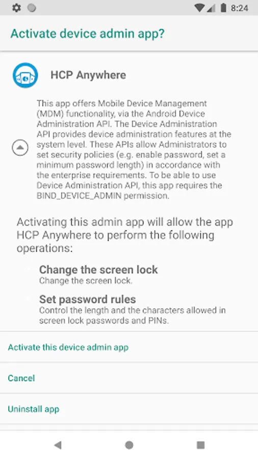 This app offers Mobile Device Management (MDM) functionality, via the Android Device Administration API. The Device Administration API provides device administration features at the system level. These APIs allow Administrator to set security policies (e.g. enable password, set a minimum password length) in accordance with the enterprise requirements. To be able to use Device Administration API, this app requires the BIND_DEVICE_ADMIN permission.