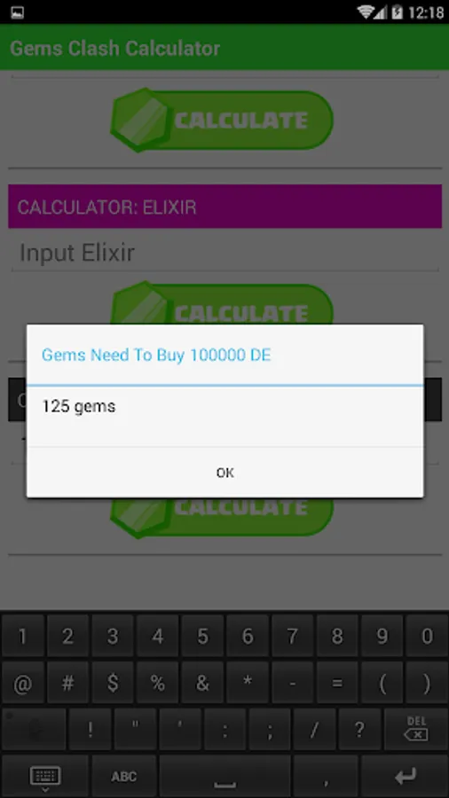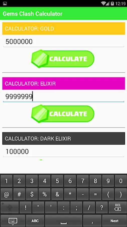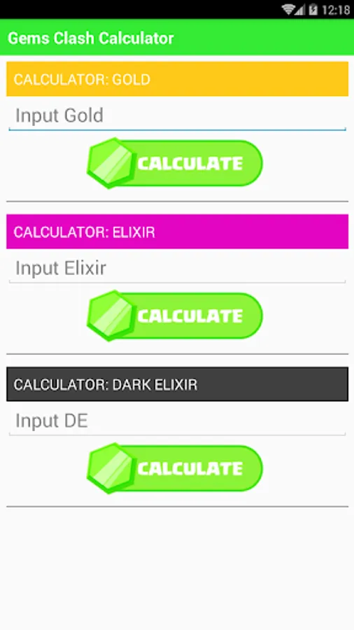 This app used Calculate the number of gems needed to buy certain amount of recources in Clash of Clans. (Gold, Elixir, and Dark Elixir)