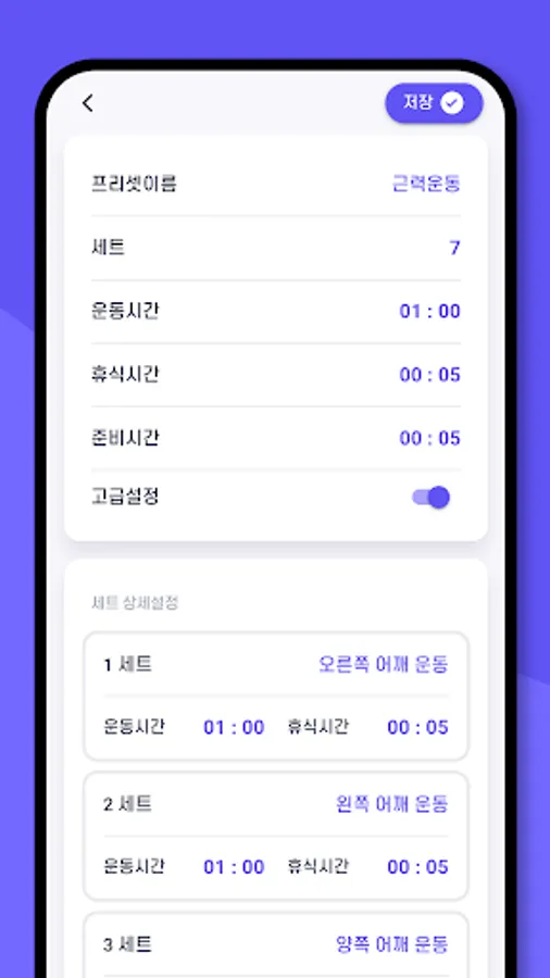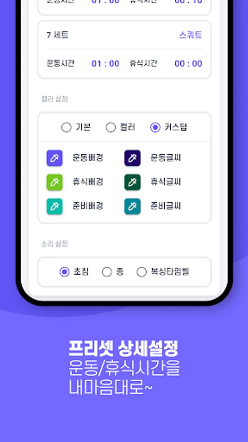 3. You can set detailed settings for each set. (Exercise time, break time, background color, text color, notification sound)