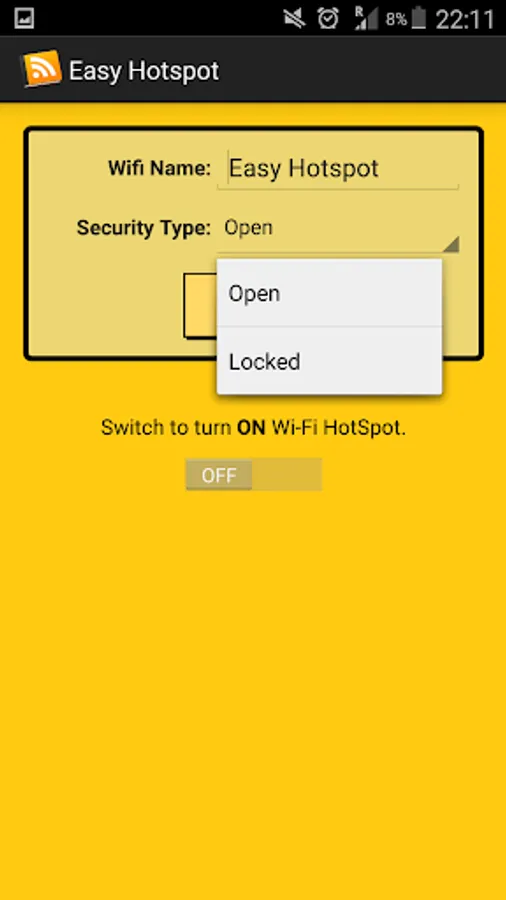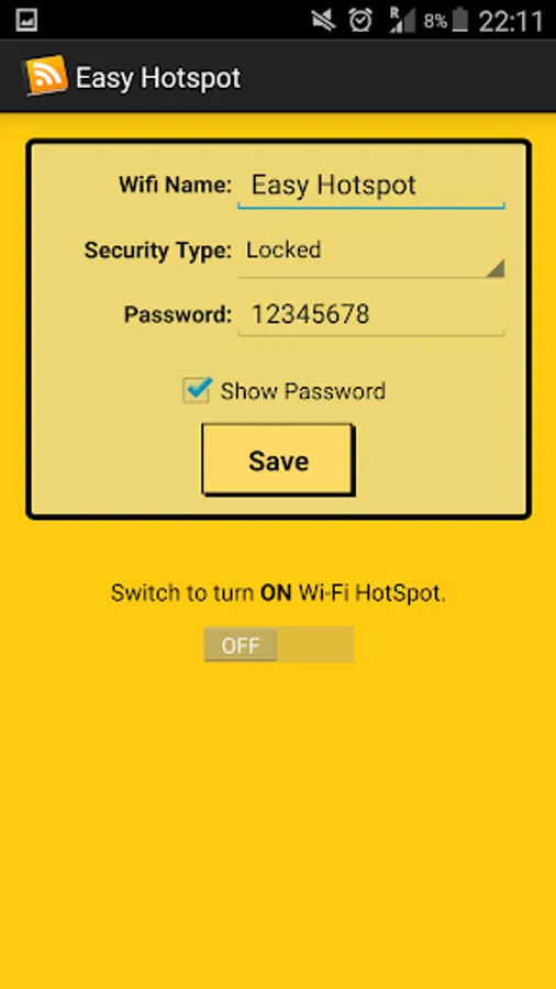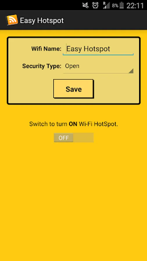 3. Press "ON" to start. Press "OFF" to stop easy hotspot.