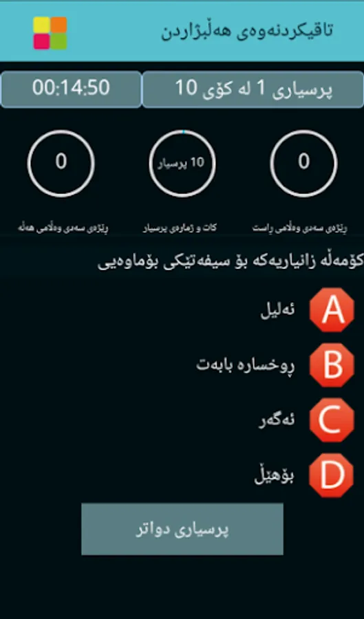 1. تاقیکردنەوە ی هەڵبژاردن بۆ 10 نمرە ، 20 نمرە ،50 نمرە بە بەبەکارهێنانی کات یان بە بێ بەکارهێنانی کات ، هەروەها دەتوانیت بۆ مانگی یەکەم ، وەرزی یەکەم ، مانگی یەکەمی وەرزی دوەم یان کۆتایی وەرزی دوەم تاقیکردنەوە بکەیت و ئەنجامەکان ببینیتەوە.